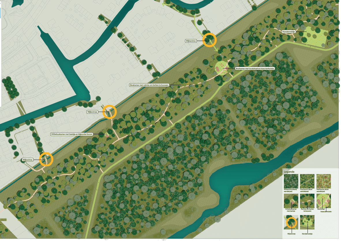 Voor de boskamer in Nobelhorst hebben bewoners hun ideeën en invulling aangedragen tijdens participatiebijeenkomsten in 2023. Tijdens de bijeenkomsten dachten bewoners mee over ‘hun plek in het bos’. Bewoners kozen liever voor een route langs meerdere plekken dan voor losse locaties. Daarom ontstond het idee van een pad dat de wijk met het bos verbindt: het “boskamerlint”. Dit is de route langs verschillende plekken in de boskamer met elk een eigen functie. In september 2025 zijn we gestart met de werkzaamheden in het bos, de werkzaamheden gaan door tot in begin 2026.